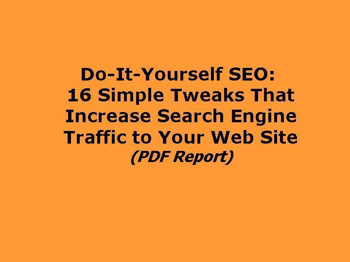 To share these success secrets I wrote a little report called Do-It-Yourself SEO: 16 Simple Tweaks That Increase Search Engine Traffic to Your Web Site. It includes screen shots showing the search engine optimization tactics to put into place, with explicit instructions, and it costs $19.95. Order it now.